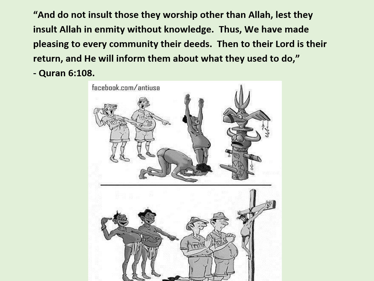 GOD prohibits His Messenger and the Believers from insulting the false deities of the idolators. Insulting their deities will lead to a bigger evil than its benefit for the idolators might retaliate by insulting GOD as the Believers [Muslim] believe “Allah,” none has right to worship but He لآ إلَهَ إلاَّ الله