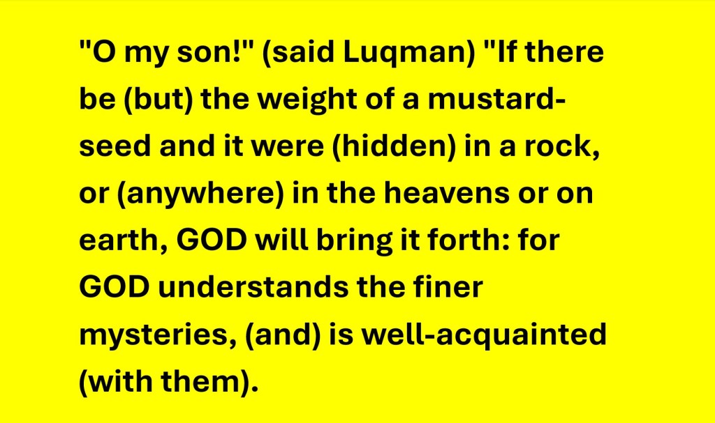 “O my son!” (said Luqman) “If there be (but) the weight of a mustard-seed and it were (hidden) in a rock, or (anywhere) in the heavens or on earth, GOD will bring it forth: for GOD understands the finer mysteries, (and) is well-acquainted (with them). (16)