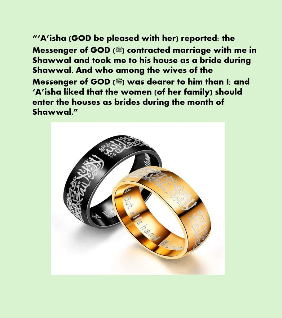 “‘A’isha (GOD be pleased with her) reported: the Messenger GOD (ﷺ) contracted marriage with me in Shawwal and took me to his house as a bride during Shawwal. And who among the wives of the Messenger GOD (ﷺ) was dearer to him than I, and ‘A’isha liked that the women (of her family) should enter the houses as brides during the month of Shawwal.”