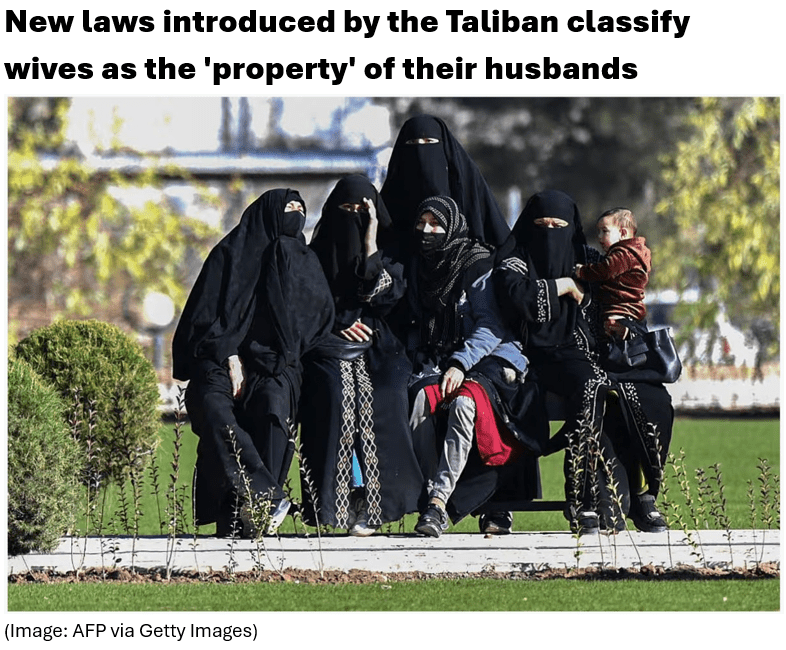 The law uses language effectively treating wives as the “property” or “slaves” of their husbands, and strips away vital protections, such as the 2009 law on the Elimination of Violence Against Women (EVAW), which was introduced during the previous US-backed regime.